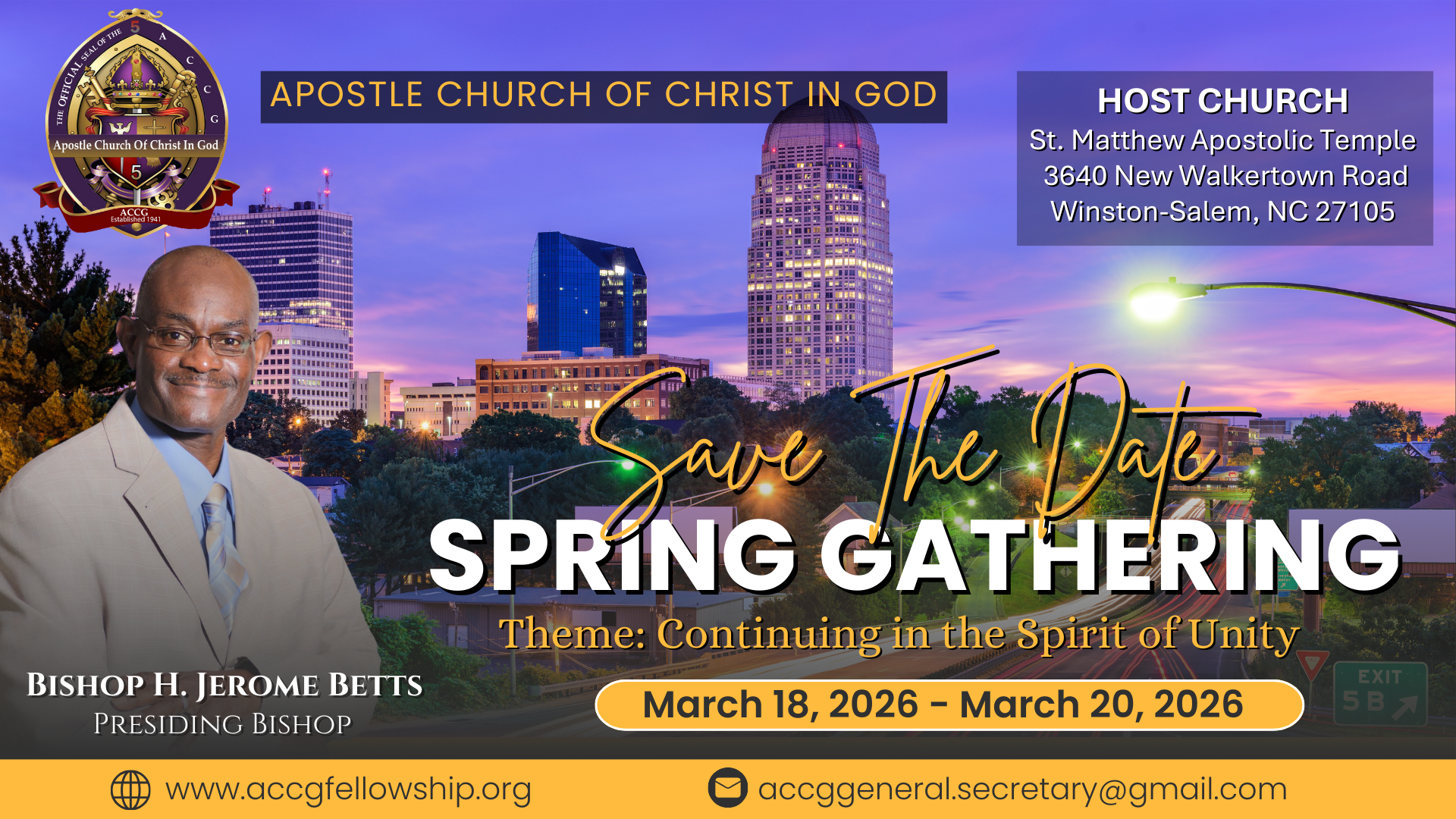 The Apostle Church of Christ in God invites you to join us for our annual Spring Gathering, a time of spiritual renewal, fellowship, and leadership empowerment.